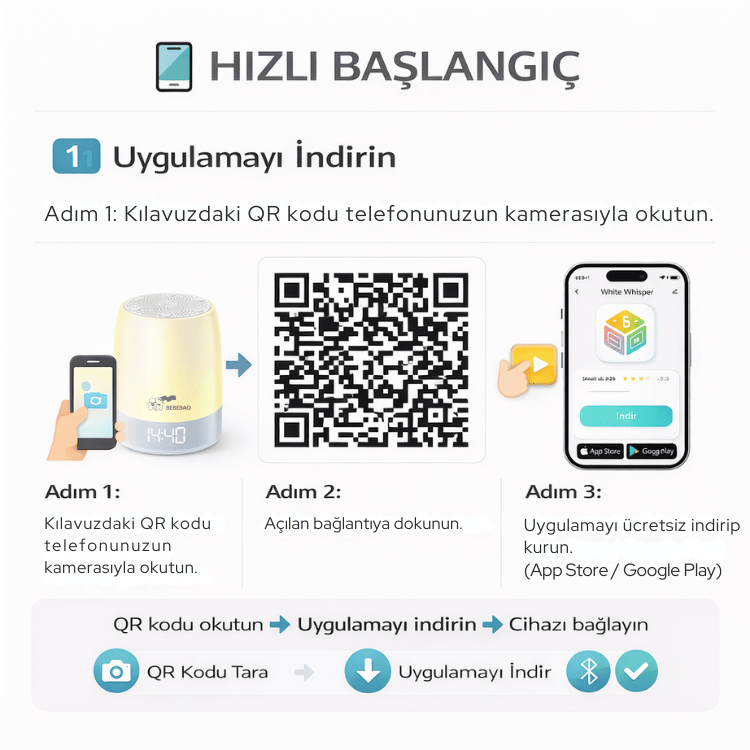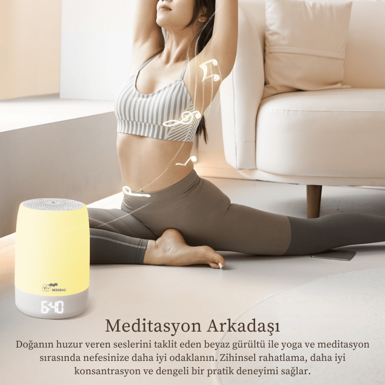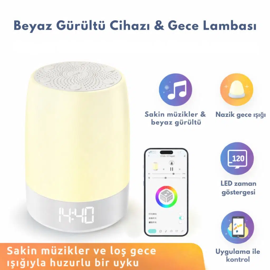 ZENN Beyaz Gürültü Cihazı; rahatlatıcı sesler, yumuşak gece ışığı ve akıllı uygulama kontrolü ile hem yetişkinler hem de bebekler için ideal bir uyku ortamı oluşturur.