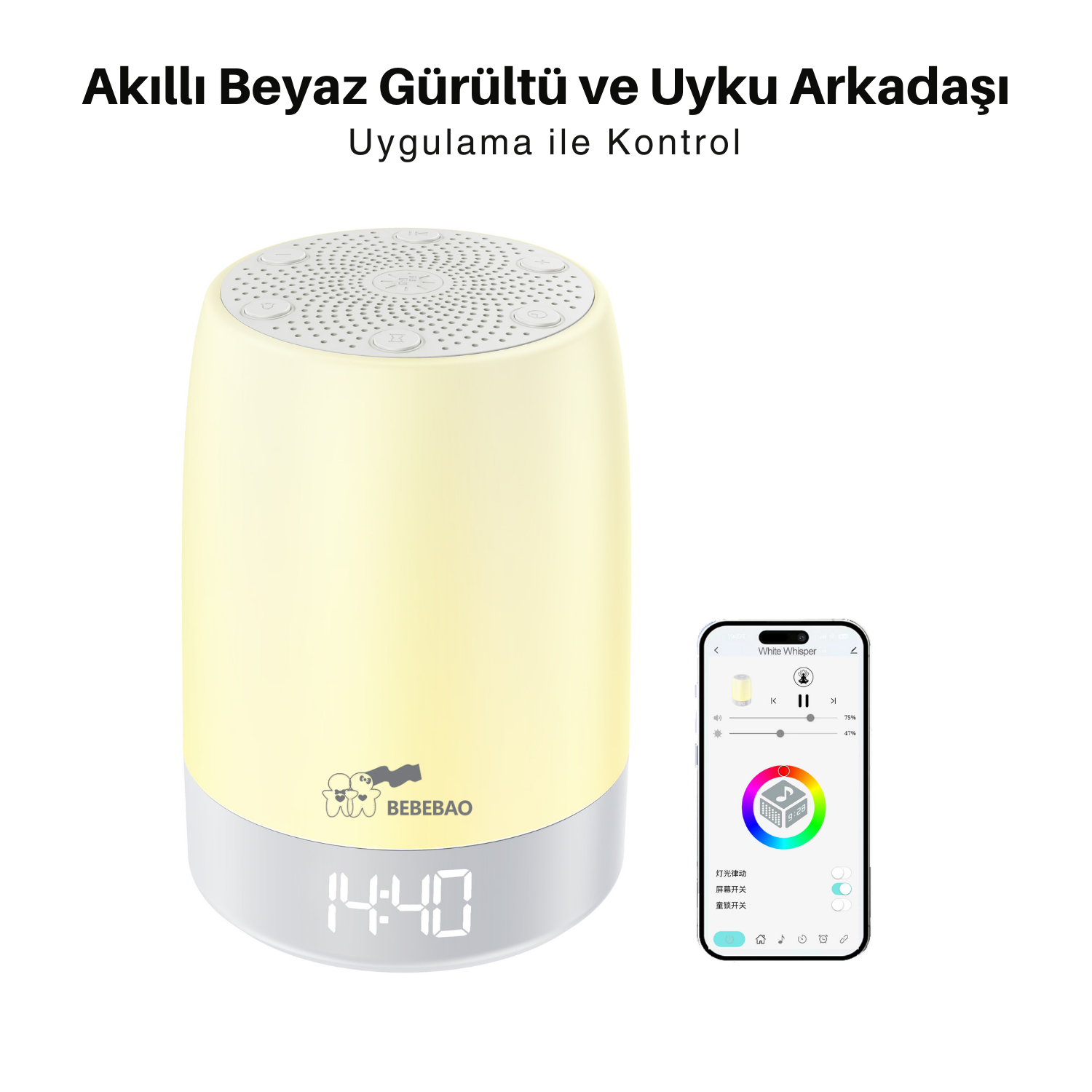 Akıllı uygulama üzerinden ışık rengi, ses seviyesi, zamanlayıcı ve müzik kontrolünü kolayca yönetin.